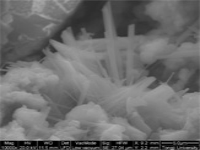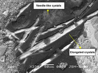 放大的圖片清楚地顯示 裂縫中的粗糙長晶體 和細小針狀晶體 |